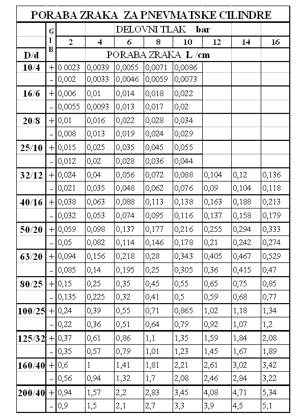 Porabo zraka se računa glede na normalno stanje, že preračunane vrednosti dobimo v tabeli.