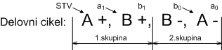 Pnevmatično vezje lahko rešimo na preprost način samo, če se gibi vseh delovnih valjev ciklično ponavljajo (A+, B+, A-, B-).