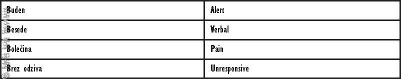Zavest poškodovanca ali bolnika ocenjujemo z lestvico 4 B (ali angl. AVPU score):