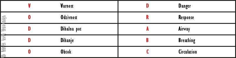 Načrt nujnega ukrepanja vsebuje pet točk. Najlaže si jih zapomnimo po začetnicah – VODDO ali DR ABC (Tabela 1). Temu sledi začetni pregled, s katerim poskušamo odkriti stanja, ki prizadetega življenjsko ogrožajo. To so stanja, ki pripeljejo do srčnega zastoja, kot so nezavest, šok, poškodbe glave, prsnega koša, trebuha ali medenice. Pri boleznih brez poškodb pa iščemo znake hudih nenadnih bolezni ali močnega poslabšanja hudih kroničnih obolenj (srčna in možganska kap, dihalna stiska zaradi pljučnice, astme ali podobnih bolezni, epilepsija, zastrupitve ipd.).