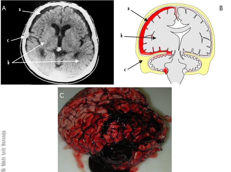 B – Shematični prikaz stanja – vzdolžni prerez, ki lahko takoj ali čez čas povzroči zoženje zavesti (a – krvavitev, b – možgani, c – kost).