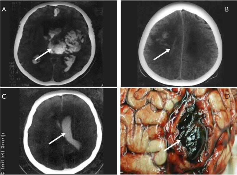 D – Znotrajmožganska krvavitev, ki jo prikaže obdukcija.