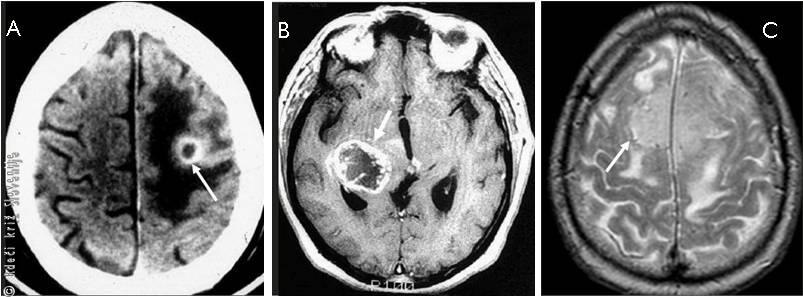 B – Magnetno-resonančno slikanje rakastega (malignega) možganskega tumorja.