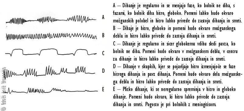 · Cheynne-Stokesova oblika dihanja – obojestranske spremembe v globini polobel, lahko presnovna motnja ali pa hudo srčno popuščanje;