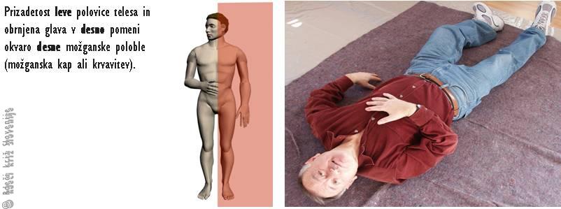 70-letni gospod je nenadoma, med hojo, padel na tla. Očividcev dogodka ni bilo. Naključni mimoidoči sprehajalec je opazil, da gospod leži na tleh, diha pospešeno, v obraz je rdeč. Na klic se je gospod odzval z momljanjem nerazumljivih besed. Počasi je odprl veki. Gospod je imel glavo močno obrnjeno v desno in je ni mogel zravnati. Na ukaz udov ni premikal, vendar pa je laik, ki je nudil prvo pomoč, opazil, da se gospodu vsake toliko časa desna noga sama od sebe pokrči v kolenu. Pri poskusu odpiranja vek je laik, ki je nudil prvo pomoč, desno veko brez težav dvignil, levo veko pa je gospod močno stiskal. Opazil je, da sta zenici ozki kot bucika, in ocenil, da sta pri zapiranju in odpiranju vek zenici ostanali enaki. Ko mu je stisnil mišici nad ključnico in Ahilovo kito, je gospod odmaknil le leva uda. Pulz je bil pospešen in plitev. Poklical je reševalno postajo in reševalcu opisal, kaj je ugotovil. V času čakanja na reševalni prevoz, kar je trajalo 10 minut, je gospod pričel normalno dihati, še vedno pa ni premikal desnih udov niti spontano niti na bolečino. Pričel je sam odpirati veki, zenici sta bili sedaj nekoliko širši, odzivali sta se na svetlobo. Položaj za nezavestnega ni bil potreben.