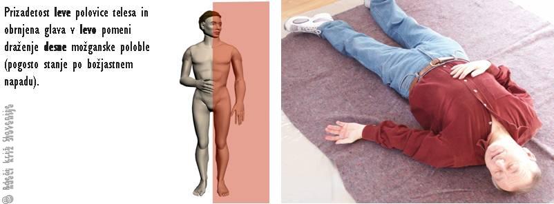 B – Položaj telesa pri nezavestnem bolniku – decerebracija, ki pomeni okvaro celotnih možganov (na bolečino je reakcija ekstenzija).