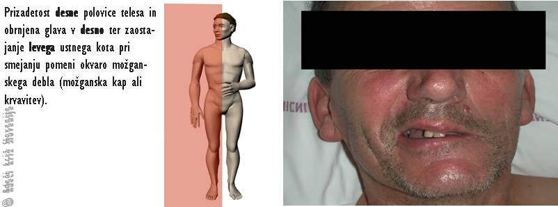 S – stroke (angleško), možganska kap: Zaradi zamašitve možganske žile (Slika 3) ali razpoka arterije in posledične možganske krvavitve (Slika 4) nenadoma odpove polovica telesa, lahko vsi udi in pogosto (ne vedno) se zmotni zavest. Pomembno je, da pravočasno pomislimo in prepoznamo znake in simptome možganske kapi (neobčutljivost polovice telesa, nemoč v udih, moten govor), kajti ob pravilnem in hitrem ukrepanju v bolnišnici izboljšamo stanje (glej poglavje 14).