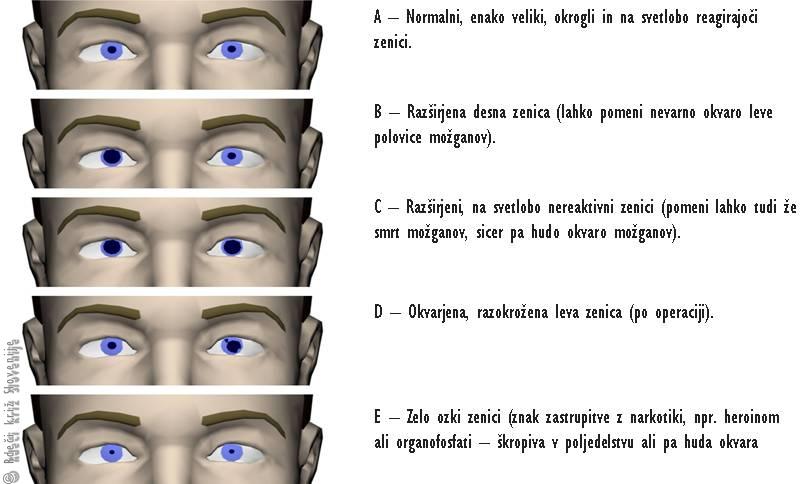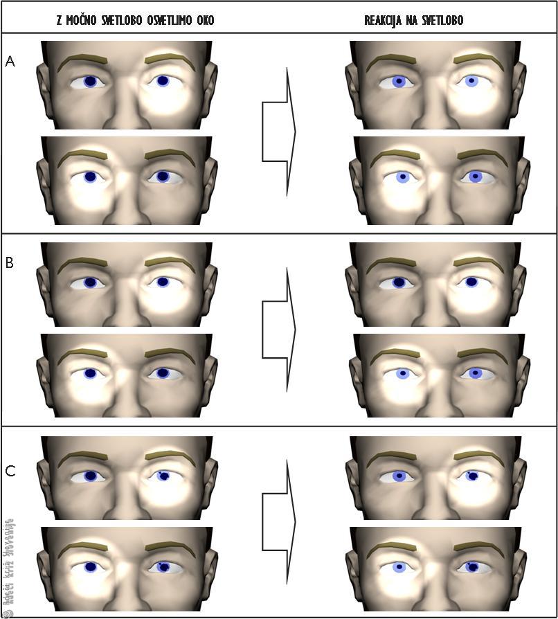 Zenici in reakcije na močno osvetlitev enega očesa (direktna reakcija na svetlobo in reakcija na svetlobo na drugem očesu).