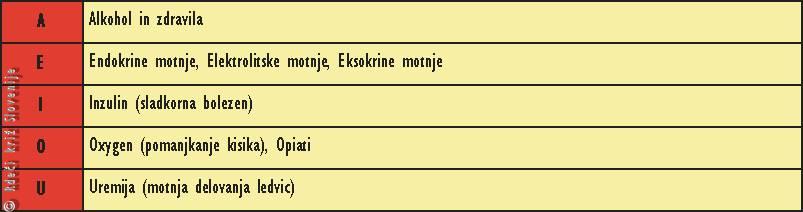 A – alkohol in zdravila: Alkohol lahko povzroči le blago zaspanost, lahko pa agresivnost, pri večjem odmerku tudi nezavest. Podobno je z nekaterimi zdravili (npr. protibolečinskimi), ki v kombinaciji z alkoholom ali z drugimi zdravili ali pri previsokem odmerku zožijo zavest.