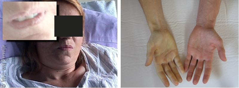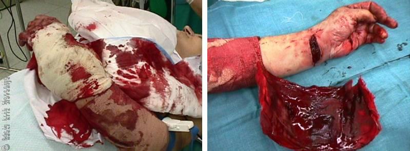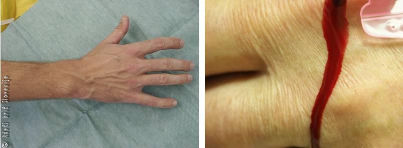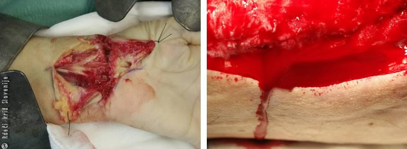 63-letna bolnica se je po družinskem prepiru z nožem porezala po dlanski strani zapestja. Iz rane je močno krvavela (iz prekinjenih ven in arterij).
