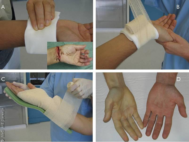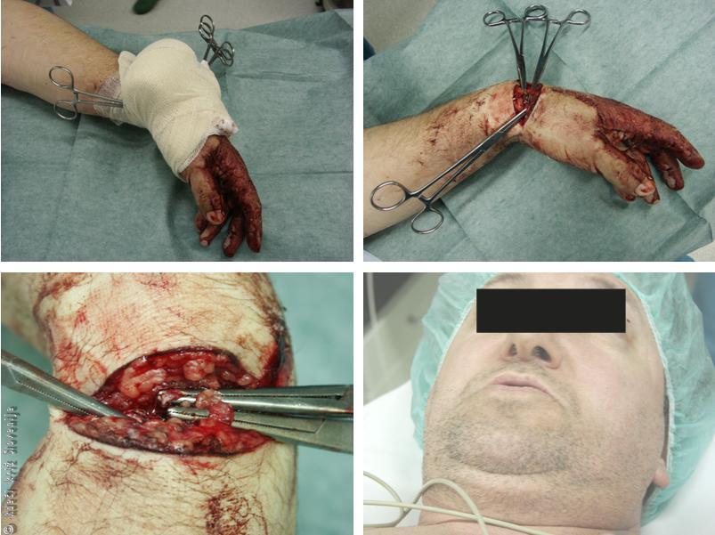 Ob sprejemu v bolnišnico je bil bolnik bled in nemiren, imel je znižan krvni tlak (90/60 mmHg). Takoj so pričeli z nadomeščanjem tekočin in ga premestili v operacijsko dvorano, kjer so ugotovili, da ima prekinjene večje povrhnje vene, kite iztegovalke za palec in kazalec, prekinjeno kožno vejo (radialnega) živca in arterijo v področju anatomske tobačnice in poškodovan zapestni sklep. Vse prekinjene strukture smo zašili in bolnika tretji dan odpustili v domačo oskrbo. Za zaustavitev krvavitve s prijemalko po Peanu se le izjemomoma odloči le strokovno usposobljena oseba v primeru, da s kompresijko obvezo in drugimi načini ne bi mogli zagotoviti varnega prevoza.