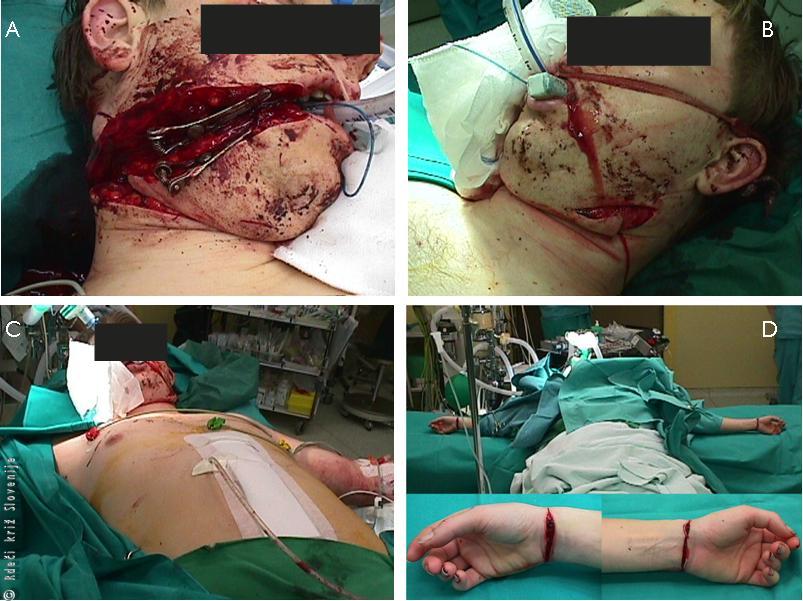 V prostor za oživljanje je fant prišel z močno znižanim krvnim tlakom (70/40 mmHg). Pričeli so s hitrim nadomeščanjem izgubljene krvi preko perifernih venskih poti s kristaloidi in koloidi v razmerju 3 : 1 in s krvnimi pripravki. Bolnika je bilo potrebno premestiti v operacijsko dvorano in zašiti prekinjene veje obraznega živca, podvezati manjše in zašiti večjo arterijo na obrazu, zašiti rane na obrazu in vratu. Hkrati so abdominalni kirurgi iz trebušne votline odstranili približno 750 ml krvi in zašili jetra ter izključili druge poškodbe organov v trebušni votlini. Nato je bilo potrebno oskrbeti še obe urezni rani na roki pri dekletu. Prerezala si je kožo, povrhnje ležeče kožne vene in kito upogibalko zapestja na palčevi strani.
