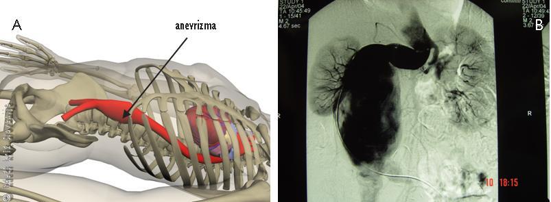 B – Slikovna preiskava s kontrastnim sredstvom natančno prikaže mesto spremenjene aorte.