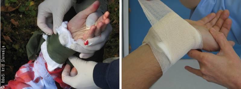 3. Ne odstranjujemo povojev le zato, da bi videli, ali iz rane še krvavi. Manj ko rano razmikamo, več je možnosti, da se krvavitev ustavi.