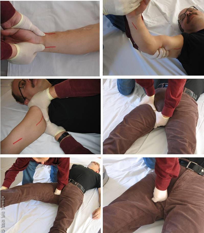 Mesto pritiska področnih arterij za zaustavitev krvavitve. Krvavitev na udih in obrazu lahko omejimo ali zaustavimo s pritiskom na večjo področno arterijo, ki dovaja kri v poškodovano področje. Zato moramo vedeti, kje potekajo glavne arterije in kje jih lahko pritisnemo ob kost. Slike prikazujejo najpomembnejša mesta, kjer s pritiskom prstov ali pesti zaustavimo krvavitev. Nikoli ne smemo pritisniti hkrati na obe vratni arteriji.