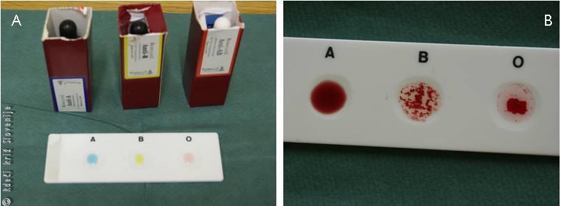Pred transfuzijo krvnih pripravkov je potrebno preveriti skladnost krvnih skupin. Na ploščico kanemo po 1 kapljo reagenta (anti-A, anti-B, anti-A,B). Vsaki kaplji dodamo 1 kapljo preiskovane krvi (A). Aglutinacija pomeni pozitiven rezultat (B).
