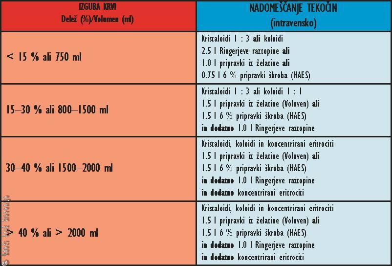 · zagotovi čim hitrejšo nadomeščanje izgubljene krvi preko perifernih venskih poti s kristaloidi (fiziološka raztopina in Ringerjev laktat) v razmerju 3 : 1 ali s koloidi (pripravki iz želatine ali škroba) v razmerju 1 : 1 ali s krvnimi pripravki (omejeni na približno 1500 ml). Odvisno od ocenjene izgube krvi je potrebno injicirati 2–3 l ustreznih tekočin v krvni obtok v 5–15 minutah, za vzpostavitev zadostnega polnitvenega volumna v ožilju, kar nam zagotavlja porast arterijskega tlaka, ki zadošča za prekrvitev vitalnih organov (osrednji živčni sistem, srce, pljuča, ledvica, jetra);
