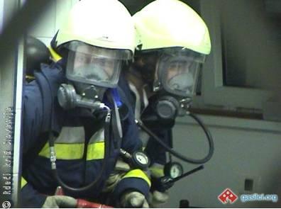 Gasilca z dihalnim aparatom.
