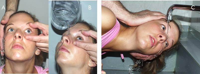 V primeru stika organskih topil z očmi oči takoj izperemo z navadno vodo iz pipe ali vrčka z livčkom.