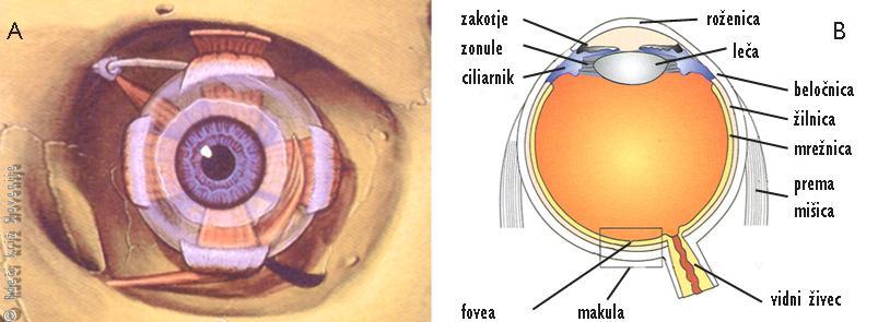 A – Zrklo z izvenočesnimi mišicami leži v orbiti.