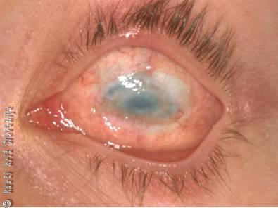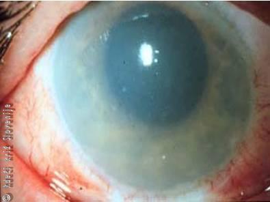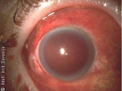 Bleda veznica in motna roženica po kemični poškodbi očesa.