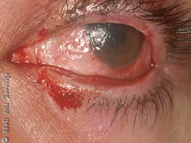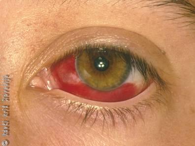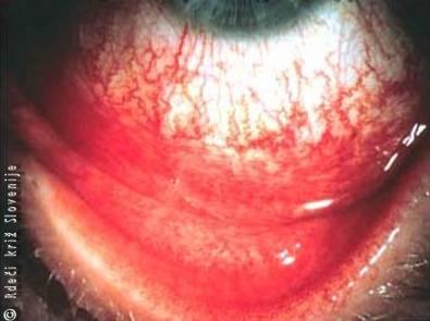 2. Pri pregledu je očesna veznica močno otekla ali prekinjena v predelu subkonjunktivalne krvavitve. Pod veznično krvavitvijo je lahko stena beločnice prekinjena v vsej debelini. Takega poškodovanca mora pogledati oftalmolog.