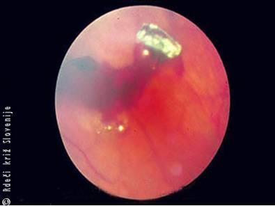 Kovinski tujek v očesu in krvavitev v steklovini.
