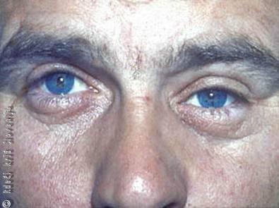 Klinični znaki: Poslabšanje vidne ostrine ob močni oteklini in rdečini s proptozo, omejena gibljivost zrkla, dovodna okvara zenice in edem vidnega živca. Lahko nastane tromboza kavernoznega sinusa.