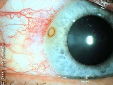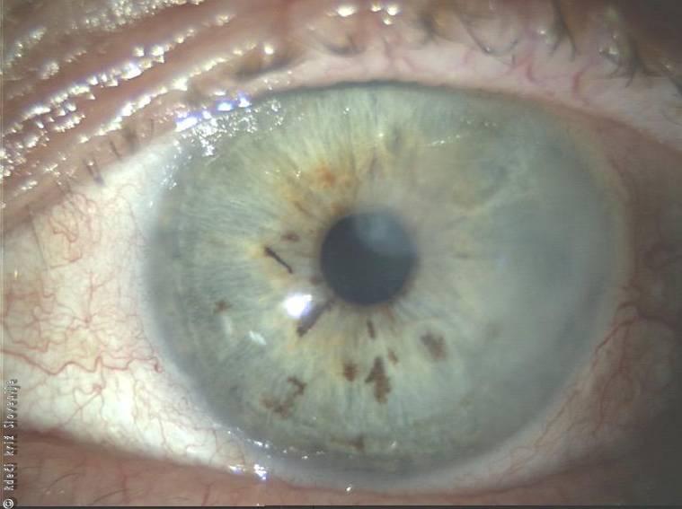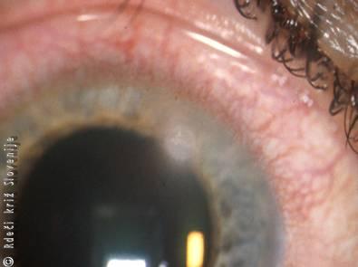 26-letni moški je opazil, da ima 3 dni rdeče oko, od včeraj pa nanj vidi bolj megleno. Zaradi kratkovidnosti nosi že več let mehke kontaktne leče in do sedaj ni imel težav. Ob pregledu je zdravnik ugotovil rdeče oko, sicer prozorno roženico z majhno belkasto motnjavo nad sredino roženice, mu predpisal kapljice Dexamethason Neomycin in mu pokril oko z zložencem. Ker se težave niso popravile, ga je napotil k oftalmologu, ki je ugotovil vnetje in globljo okvaro roženice (razjeda roženice). Po odvzemu brisa z veznice in roženice mu je predpisal antibiotične kapljice (ciprofloksacin) vsakih 30 minut. Vnetje se je izboljšalo čez nekaj dni, vendar pa je na tem mestu (zaradi globine vnetja) ostala roženica motna (Slika 24). Vid je ostal nespremenjen, ker motna roženica ni segala v vidno os (v sredino roženice).
