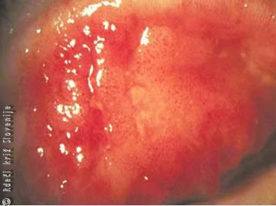 3. Pri prosevanju žilnice ali uveje skozi veznico se kaže kot modrikasto obarvanje veznice. Nastane zaradi prekinjene stene beločnice (Slika 7A).