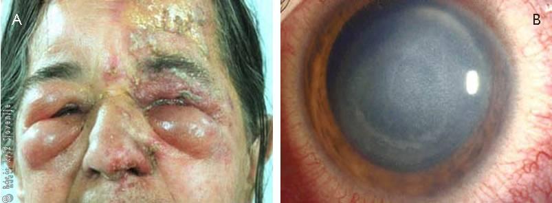A – Herpes zoster z izpuščaji po polovici obraza in močnimi oteklinami vek.