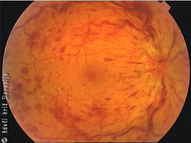 Klinični znaki: Močno poslabšanje vida pogosto pod 10 %. Pri pregledu z oftalmoskopom so prisotne številne krvavitve po celotnem očesnem ozadju, vene so široke in zvijugane, meje papile vidnega živca (slepa pega) so zabrisane.