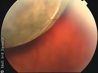 Klinični znaki: Pri pregledu z oftalmoskopom viden mehurjast odstop mežnice.