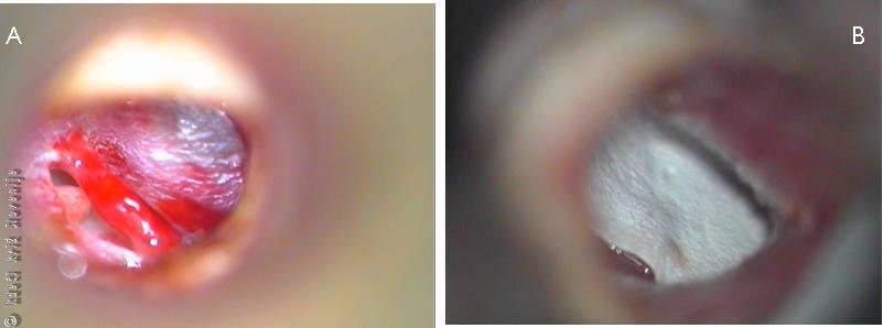 B – Stanje po reponiranju strganih robov bobniča in kritja s silastikom.