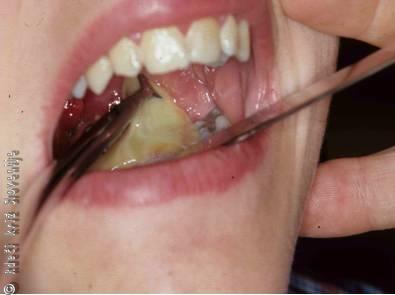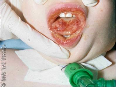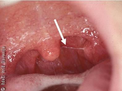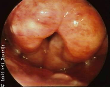 Otorinolaringolog opravi indirektni pregled spodnjega dela žrela in grla. Viden je zadebeljen, pordel, gnojen poklopec (Slika 16). Možno je, da nastane na njegovem prostem robu absces, ki se rad spontano predre. Bolnike, pri katerih se dihanje ni izboljšalo po antibiotikih in kortikosteroidih, intubiramo, in če to ne uspe, naredimo traheotomijo.