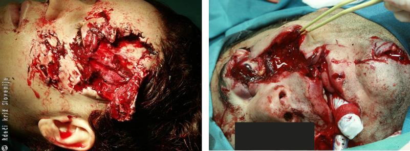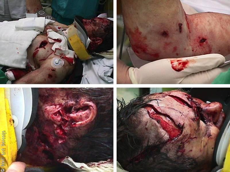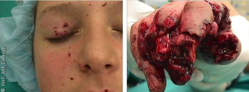 Je posledica poškodbe dela telesa s trdim predmetom kot posledica eksplozije. V ospredju so rane različnih oblik in zlomi.