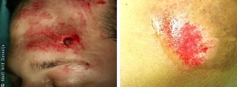 Pri praskah in odrgninah sta poškodovani vrhnji plasti kože (povrhnjica in usnjica). Praske in odrgnine na čelu in desni rami so bile posledica padca s kolesa na asfaltirano cesto.