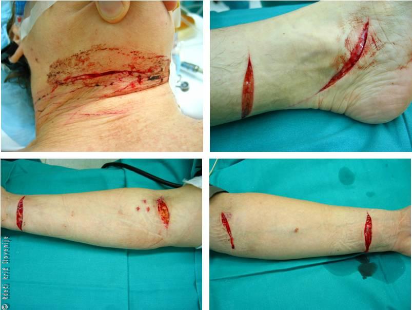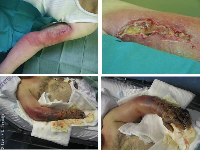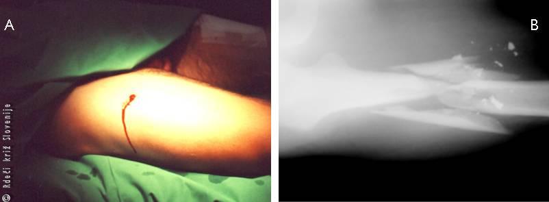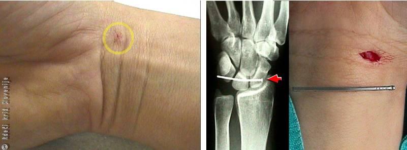 36-letna bolnica se je s konico ozkega noža v službi zabodla na dlančno stran podlakti leve roke. Nad zapestjem je bila pol centimetra velika vstopna rana iz katere je tekla modrikasta kri (venska krvavitev). Področje zapestja je bilo oteklo in boleče. Pri pregledu ni imela motenj občutljivosti in roka je bila topla, normalno prekrvljena, pulz arterije (ulnaris) na mezinčevi strani je bil dobro tipen, pulz arterije (radialis) na palčevi strani pa je bil slabše tipen. Gibljivost zapestja in prstov je bila ohranjena.