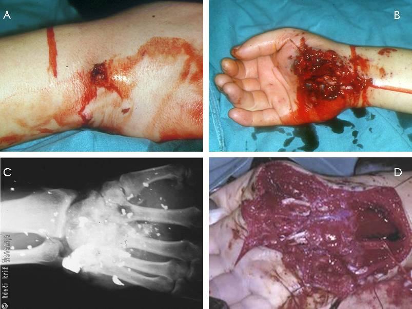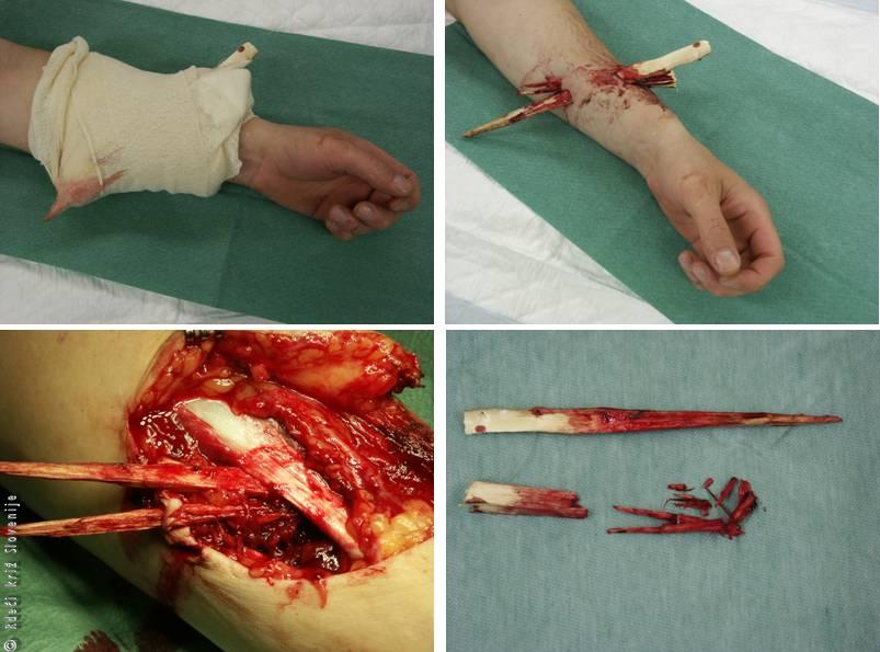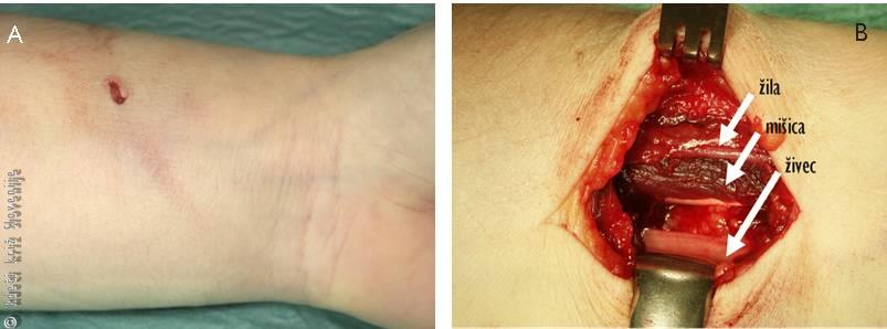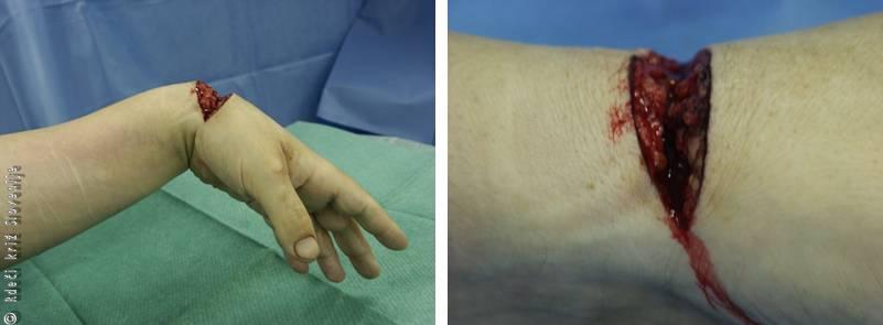 Pri kirurški oskrbi rane smo ugotovili prekinjene kožne vene in vejo arterije (radialis), večjo kolekcijo krvi (hematom), ki je delno stiskala radialno arterijo, delno prekinjeno mišico upogibalko zapestja in prstov (v kitno-mišičnem delu) in poškodovano ovojnico medianega živca.