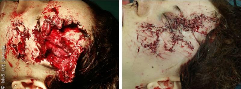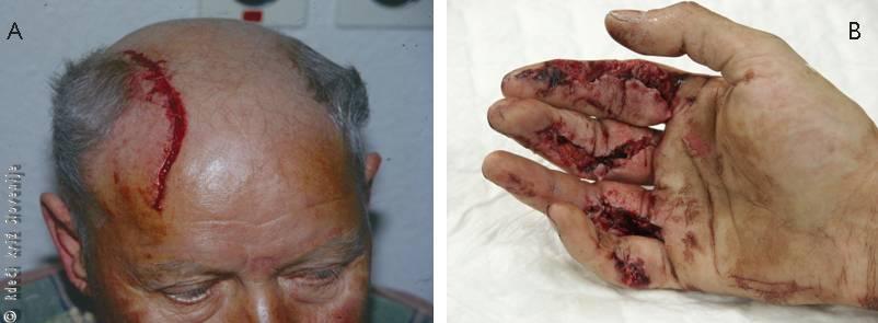 A – Razpočna rana na glavi, kot posledica udarca s topim predmetom. V okolici je vidna udarnina - kontuzijska značka.