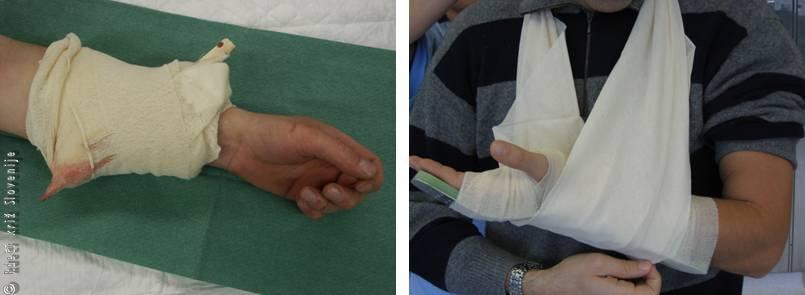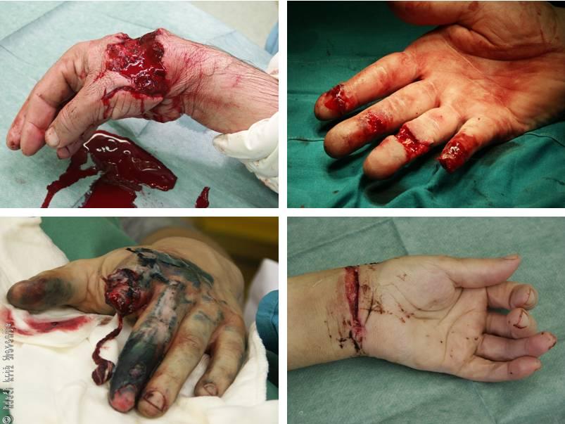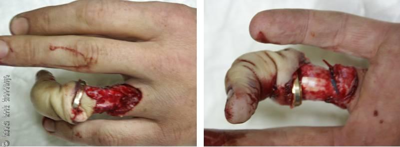58-letni bolnik se je poškodoval v domači mizarski delavnici. S krožno žago si je s slabo nabrušenim in širokim rezilom nepopolnoma odrezal tričlenske prste desne roke in popolnoma odrezal končni del palca. Doma so zaustavili krvavitev s kompresijskim povojem, pritiskom na žilo in dvignjeno roko in brez amputiranega palca odhiteli v zdravstveni dom.