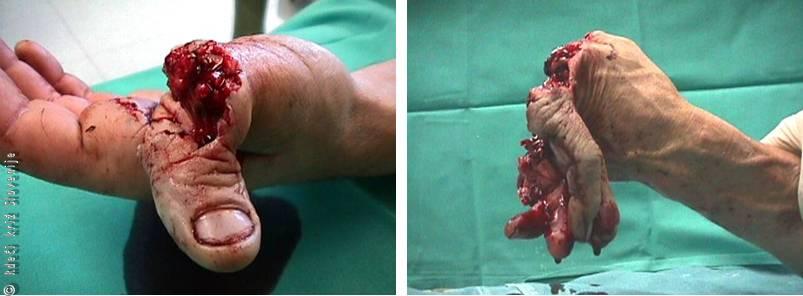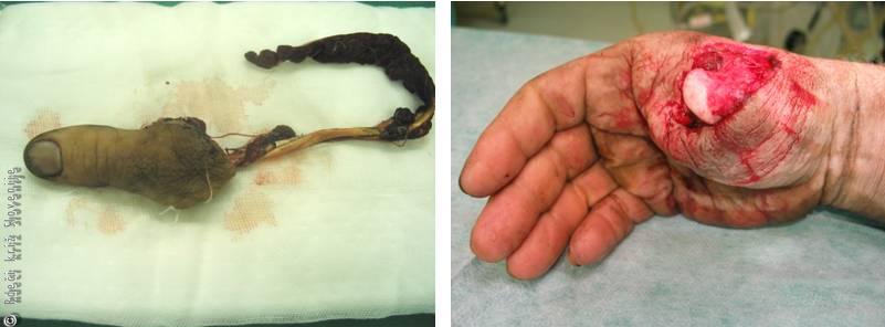 Popolna in nepopolna amputacija pri poškodbi roke s krožno žago in nepravilna oskrba amputiranega prsta.