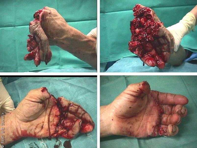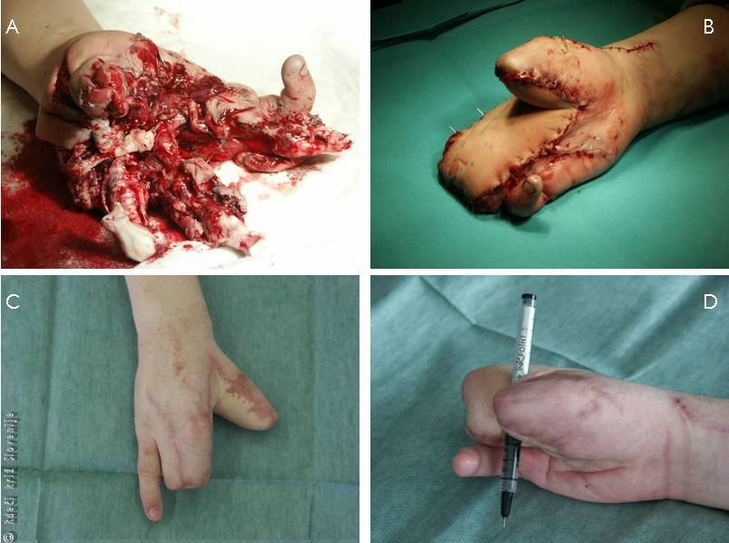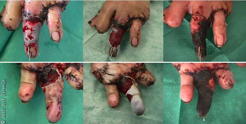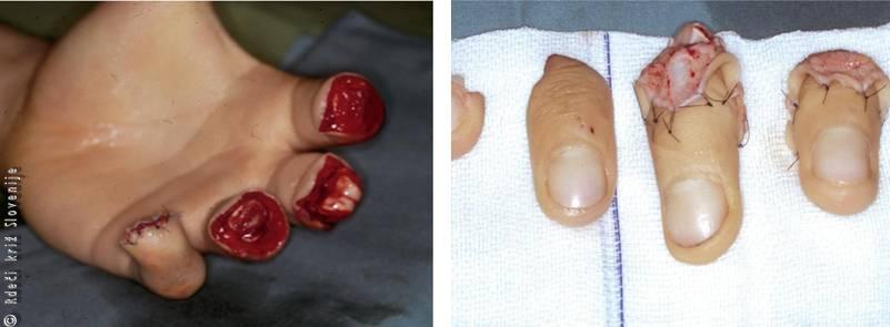 V zdravstvenem domu so nepopolnoma odrezane prste pravilno namestili v fiziološki položaj in namestili opornico ter poskrbeli za prevoz v replantacijski center. V več urni operaciji je bilo potrebno napraviti učvrstitev kosti in uporabiti sklepne proteze, zašiti kite upogibalke in iztegovalke, arterije, vene, živce in kožo in tako bolniku omogočiti dober funkcionalni in estetski izgled.