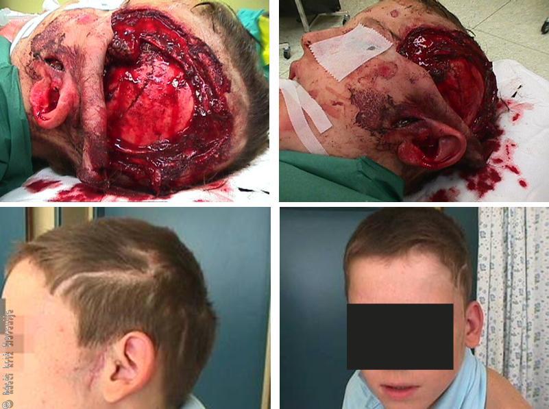 Poškodovanec, ki ga je napadel medved, je imel zlomljena vretenca vratne hrbtenice, zlomljeno nadlahtnico, zlomljeno nosno kost, obsežne raztrganine po obrazu in uhlju, prsni mišici na levi strani in podlakti, številne udarnine in praske po telesu.