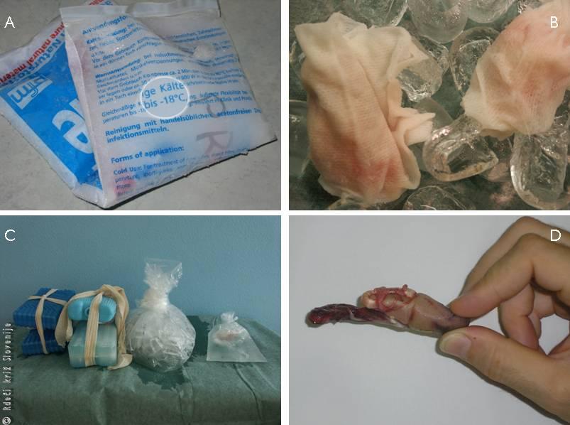 · amputirani ud sterilno pokrijemo in damo v vrečko ter ga obložimo z vrečkami, v katerih je mešanica vode in ledu.
