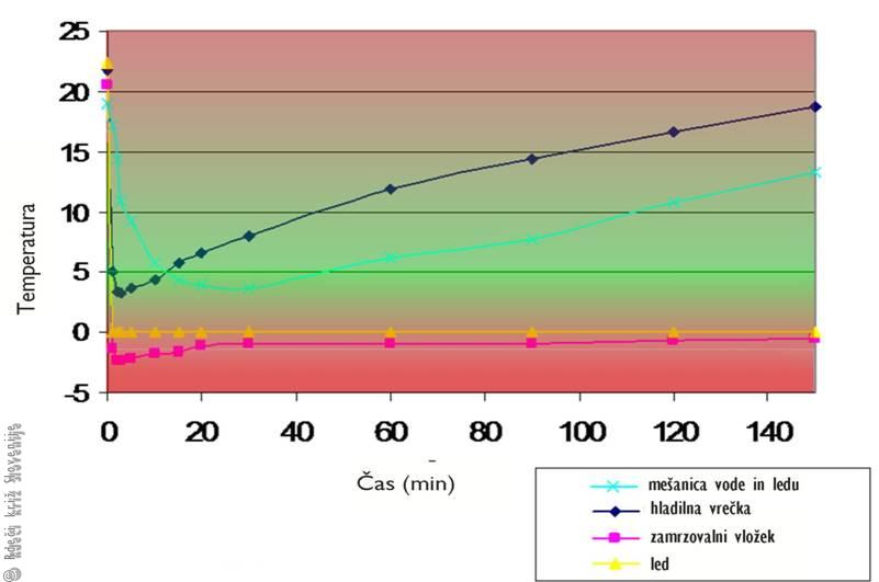 Krivulje temperature ob hlajenju z različnimi sredstvi.