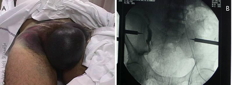 B – Angiografija, ki kaže iztekanje kontrasta iz arterij v poškodovani medenici, kar kaže na krvavitev.