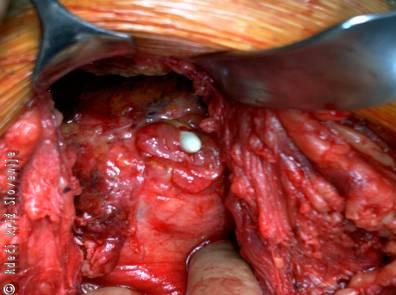 Medoperativna slika raztrganja sečnega mehurja (iz mehurja štrli vrh urinskega katetra).