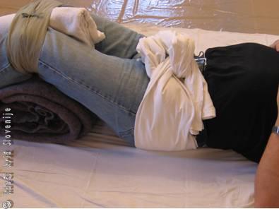 Poškodovanca namestimo v hrbtno lego. Medenični obroč se preko kolkov poveže z rjuho ali dvema trikotnima rjuhama. Spodnje okončine so v kolkih in kolenih nekoliko skrčene in v predelu kolen povezane skupaj s trikotno rjuho.
