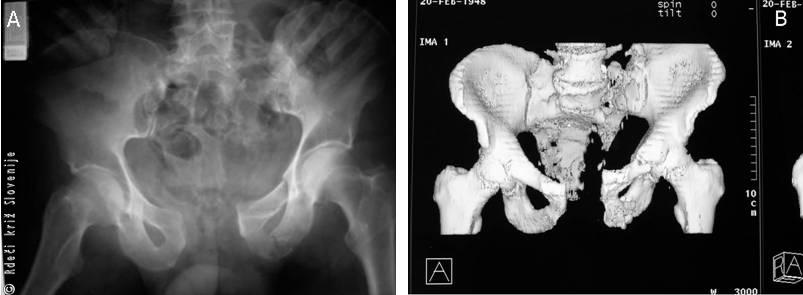 B – 3D CT visokoenergijske, povsem nestabilne poškodbe medenice. Sodobne slikovne diagnostične naprave omogočajo hitro in natančno analizo poškodb ter pravilno načrtovanje in izvedbo dokončnega zdravljenja.